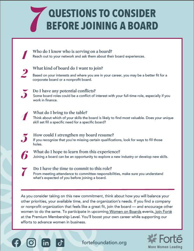 As part of Forté's efforts to change the balance of power in the workplace, we encourage women to take on leadership roles, including seats on corporate and nonprofit boards. Many of the professional members in Forté’s community have expressed interest in serving on boards but have questions about how to get started, whether they have the right qualifications, the level of commitment required, and more.