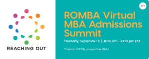 Are you a member of the LGBTQ+ community and thinking about pursuing an MBA? Join us for ROMBA's virtual Pre-MBA Admissions Summit and Expo on Thursday, September 8, 2022. The summit includes a networking session with current LGBTQ+ MBA students, panels with school admissions officers, and a Business School Expo with 70+ MBA programs. All participating schools are members of the Reaching Out LGBTQ+ MBA Fellowship, a global LGBTQ+ scholarship and leadership development collaboration between Reaching Out and top international business schools.