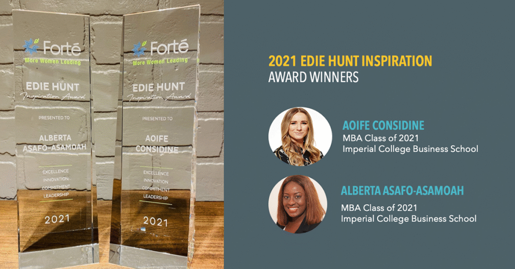Edie Hunt Inspiration Award, which recognizes the achievements of women MBAs at Forté partner schools. The 2021 winners are Alberta Asafo-Asamoah and Aoife Considine, who both earned their MBAs at Imperial College Business School. In a dual presentation, they shared a few words of advice.