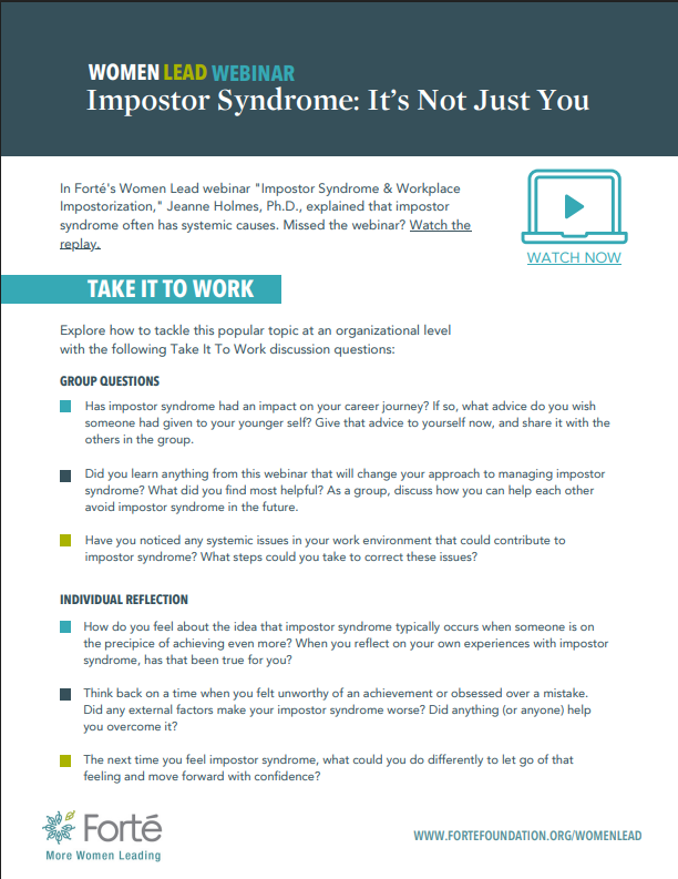 If you haven’t seen the webinar yet, watch it on demand. If possible, watch it with a few friends or colleagues so you can talk about it together afterward. Share your experiences with Impostor syndrome and discuss how the webinar prepared you to tackle it in the future. Download the discussion guide for some questions to get you started.