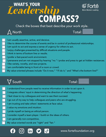 There are many leadership assessments online that you can use to identify your strengths. Here’s the one we use at Forté: What’s Your Leadership Compass? Download the pdf, check the boxes that apply to you, and add up the number you marked in each section. The highest number is your leadership orientation: North, South, East, or West. If you get a tie, your leadership style is likely a combination of both.